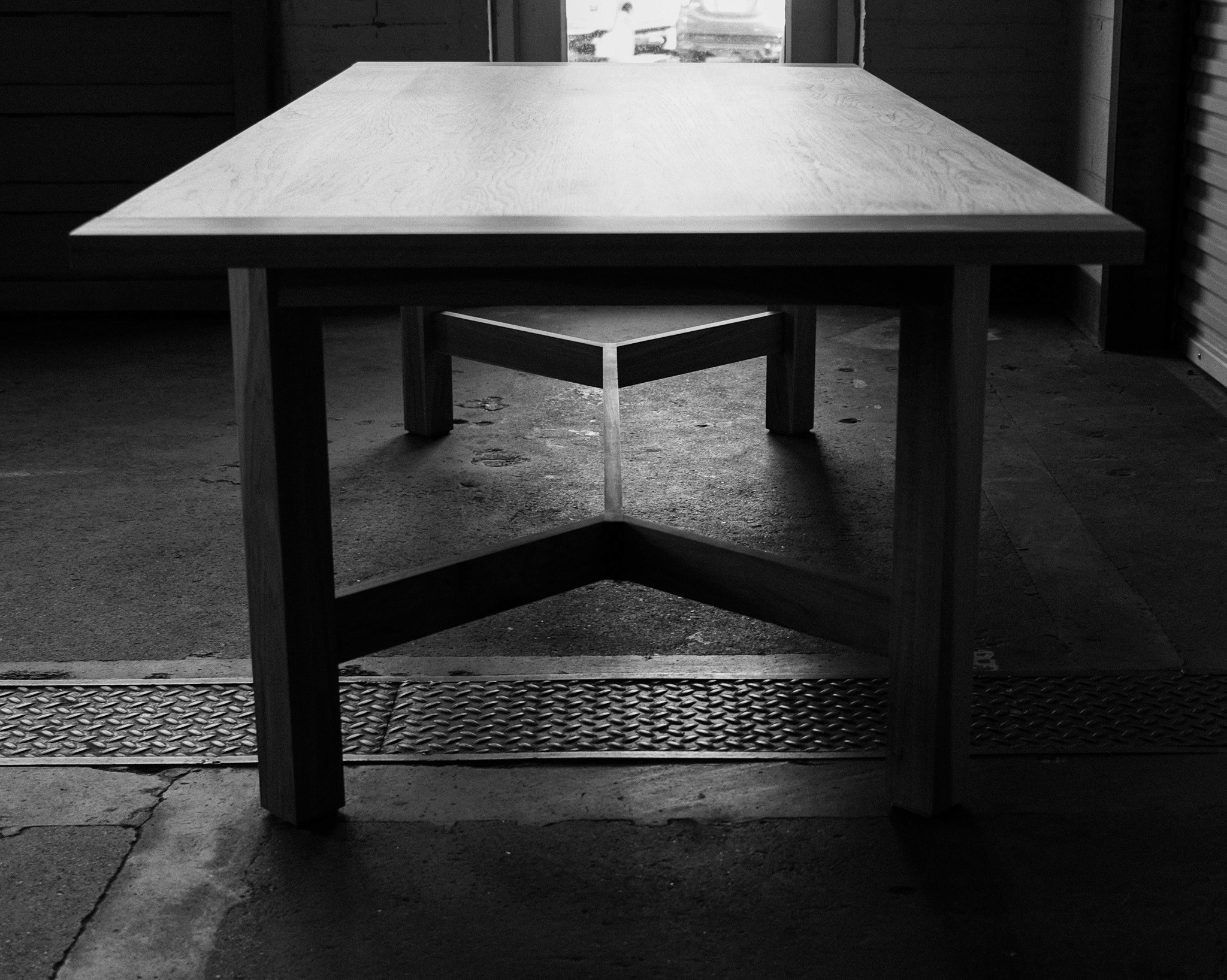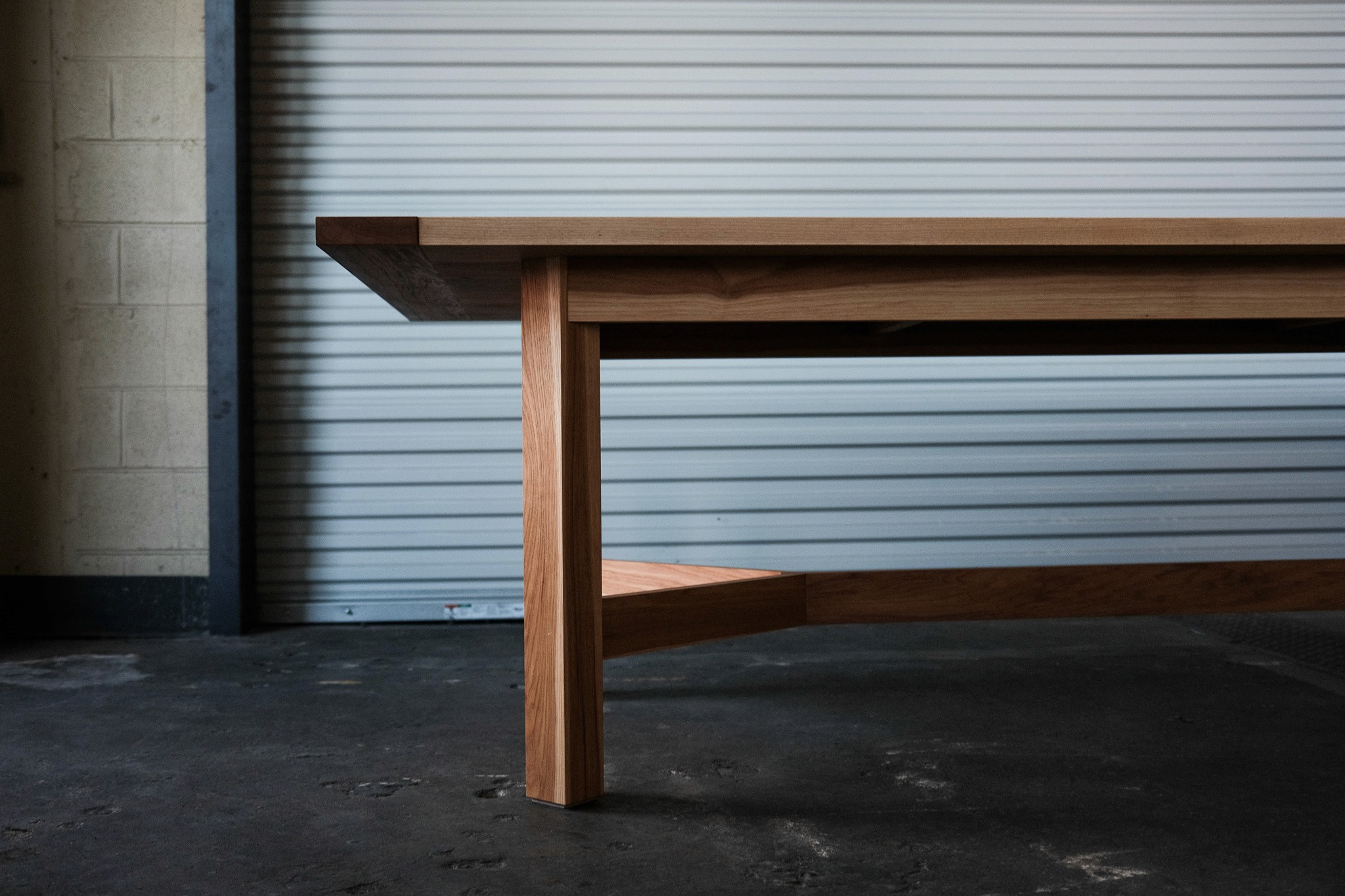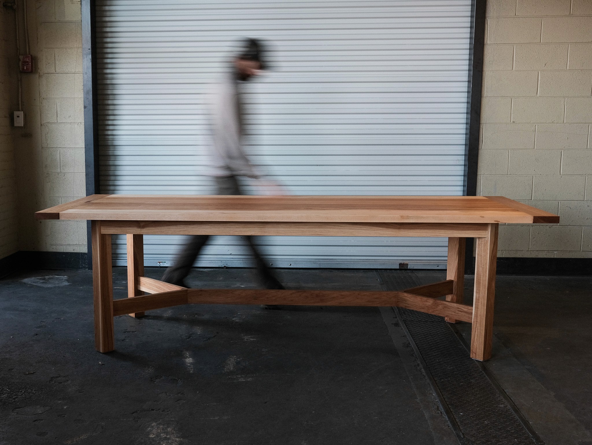 This custom dining table was designed for an arborist and his family, thoughtfully built to fit their space while comfortably seating six to eight people. We explored several wood options before settling on hickory for its strength and striking grain, which naturally contrasts between light sapwood and dark heartwood. The base features a double "Y" stretcher for structural integrity without compromising legroom. Designed with longevity in mind, the breadboards allow for seasonal movement, ensuring the table will endure for generations as a central gathering place.