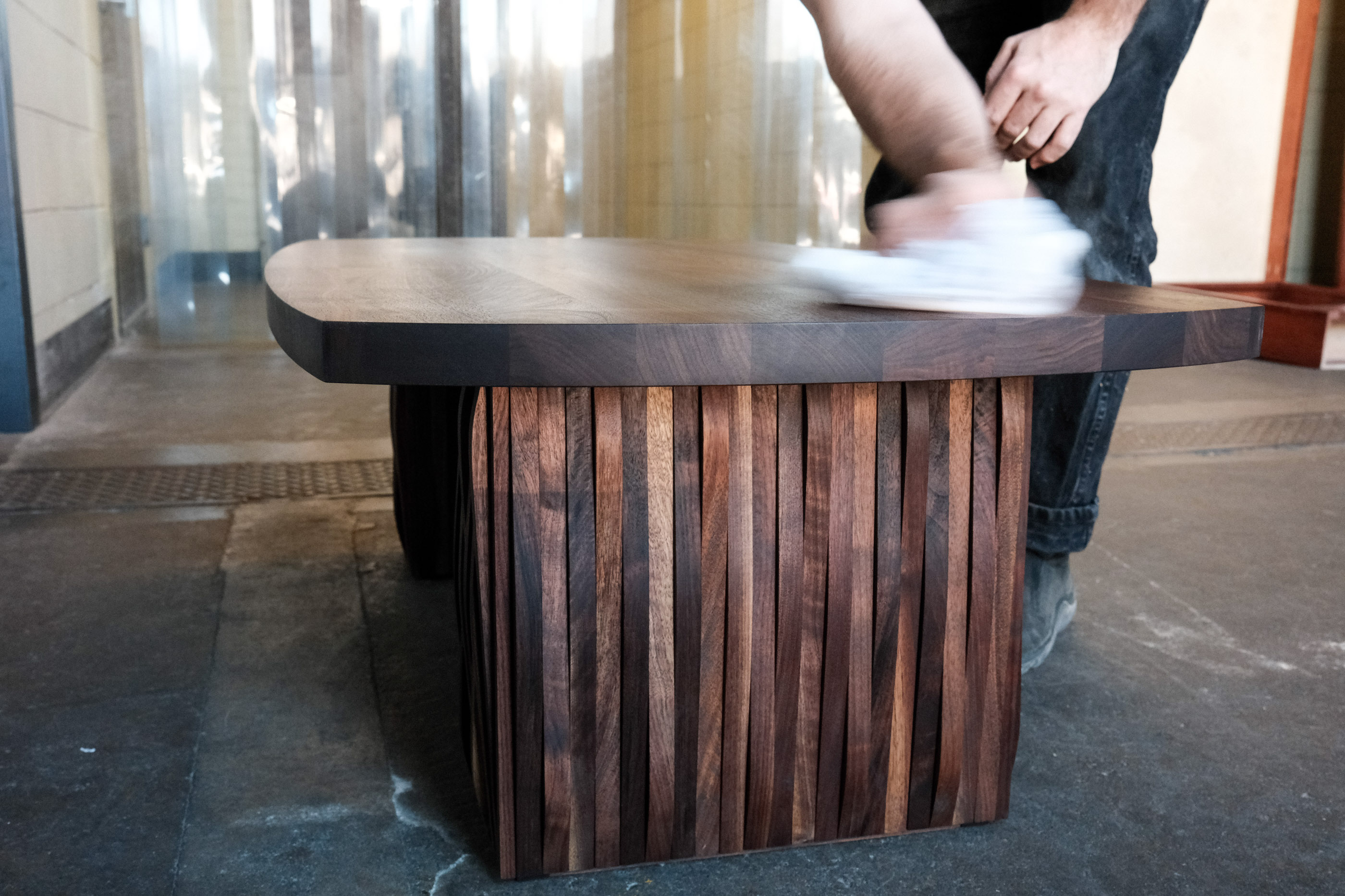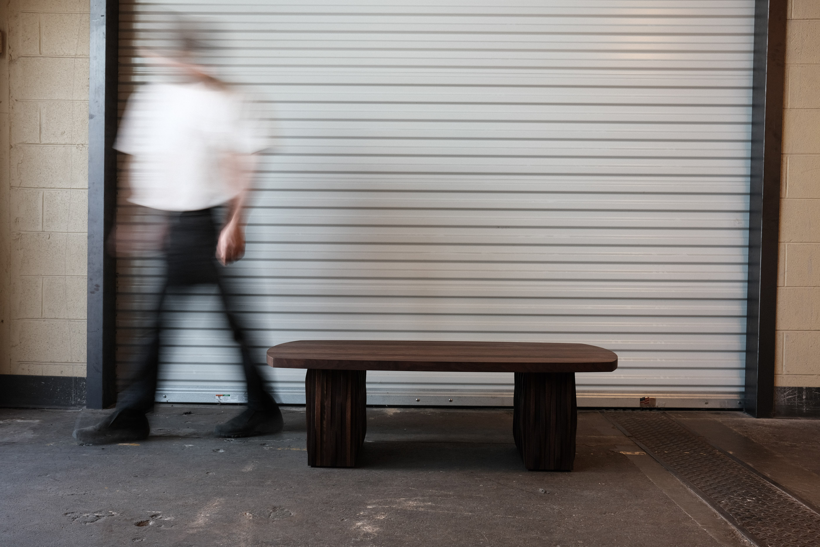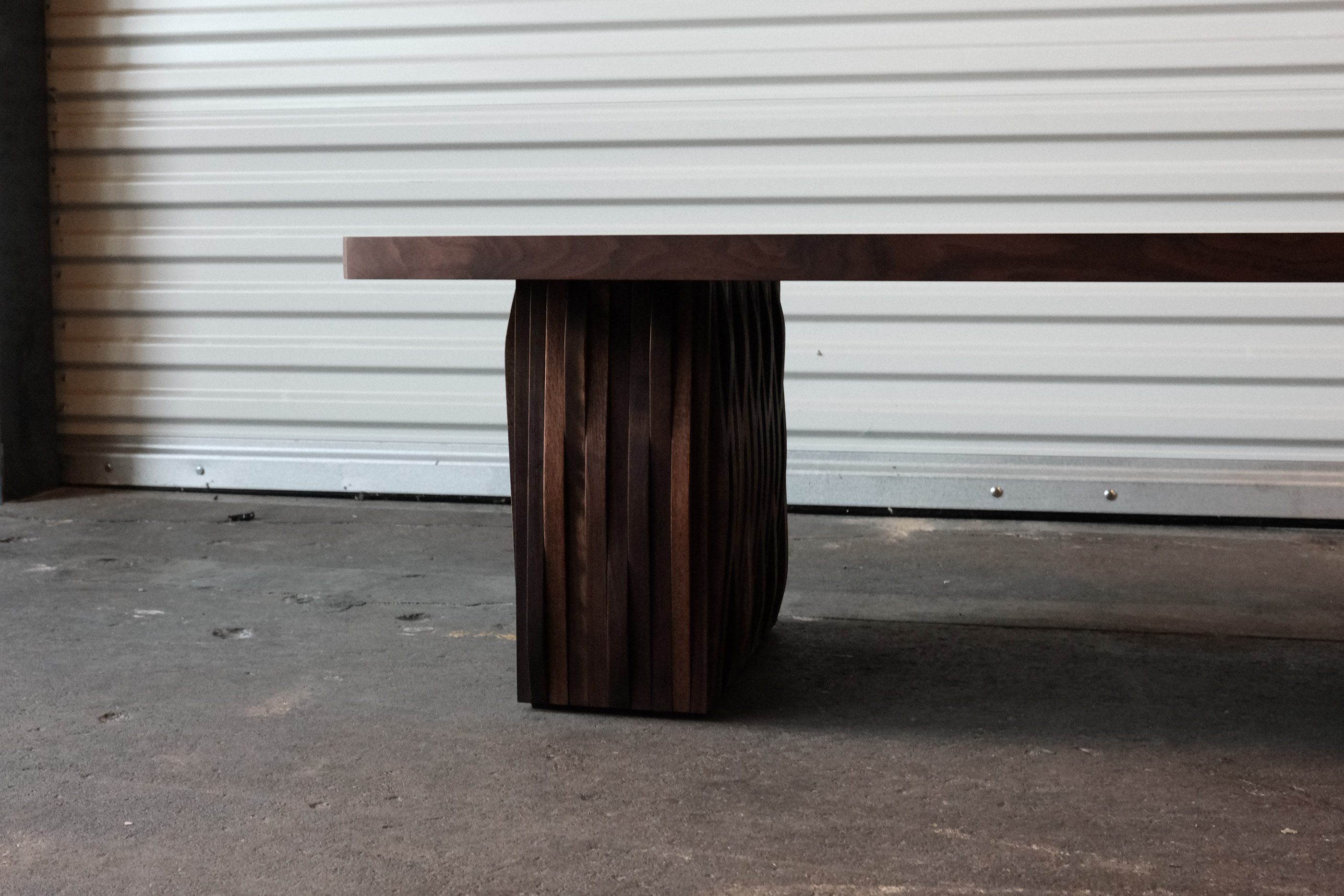 A sculptural coffee table built from solid walnut, featuring a soft, curved top that rests on twin pedestal bases. Each base is made from individually carved and shaped walnut strips, creating a flowing, textured surface that plays with light and shadow. The result is both grounded and expressive — a functional centerpiece with presence.