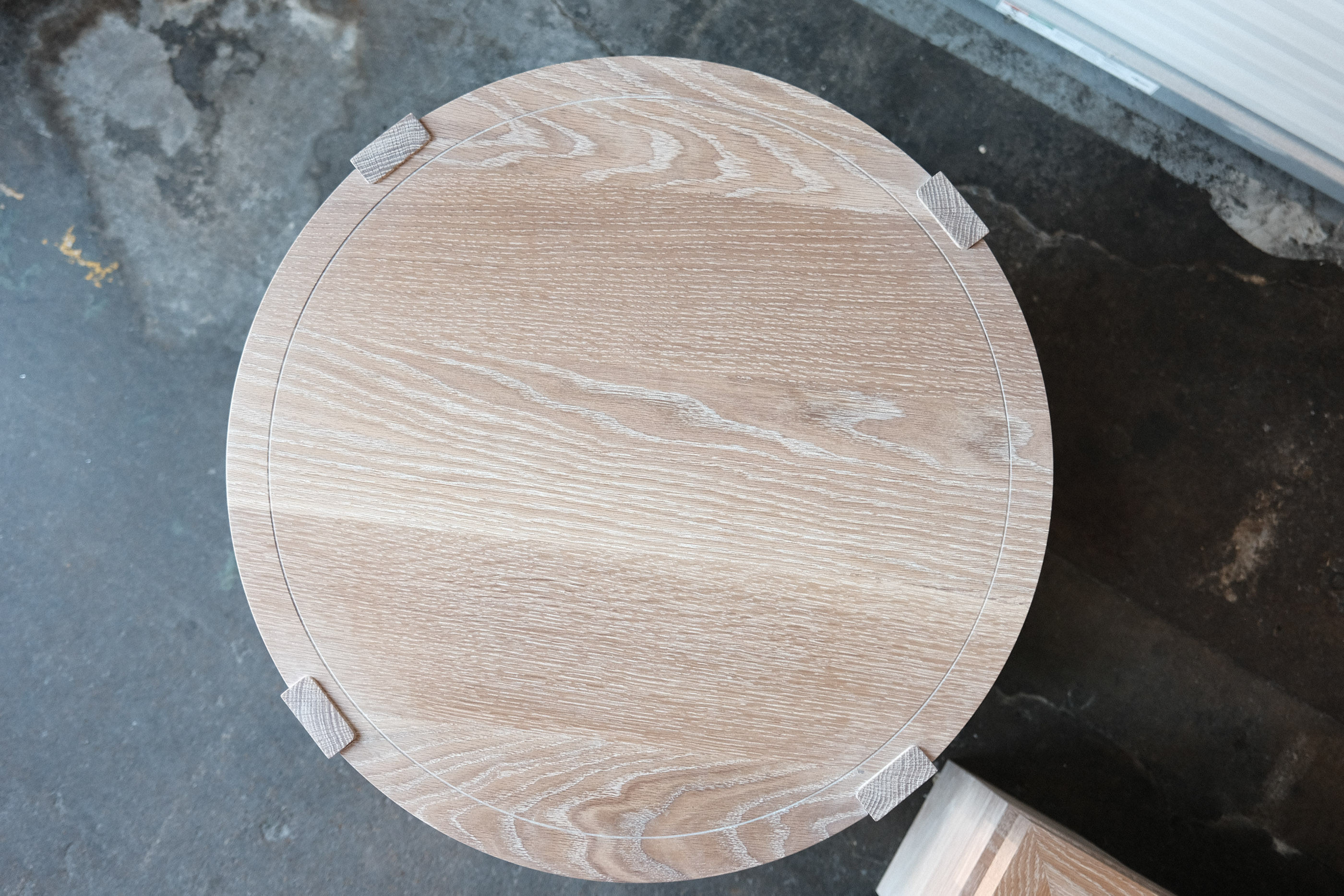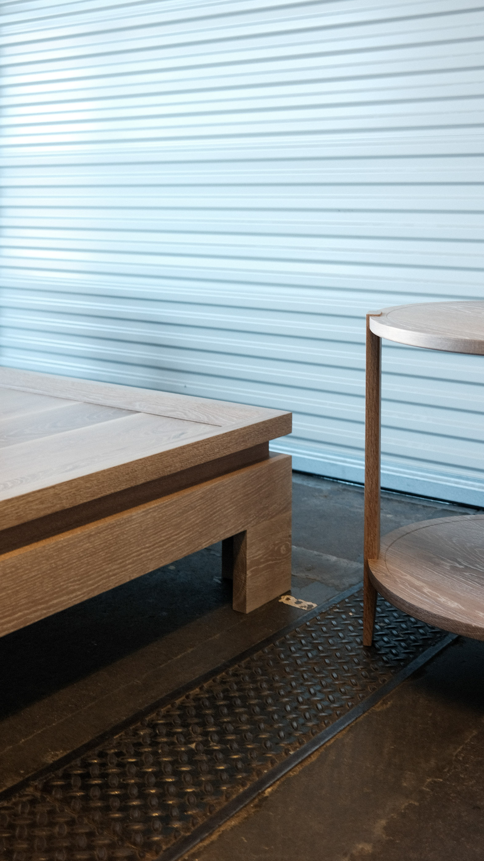 This custom living room set, designed for a family in Maine, includes two round side tables and a large coffee table, all made from solid white oak. The side tables feature round tops with pinned joinery details and open shelving below, while the coffee table’s clean geometry and generous surface anchor the space with quiet presence.
