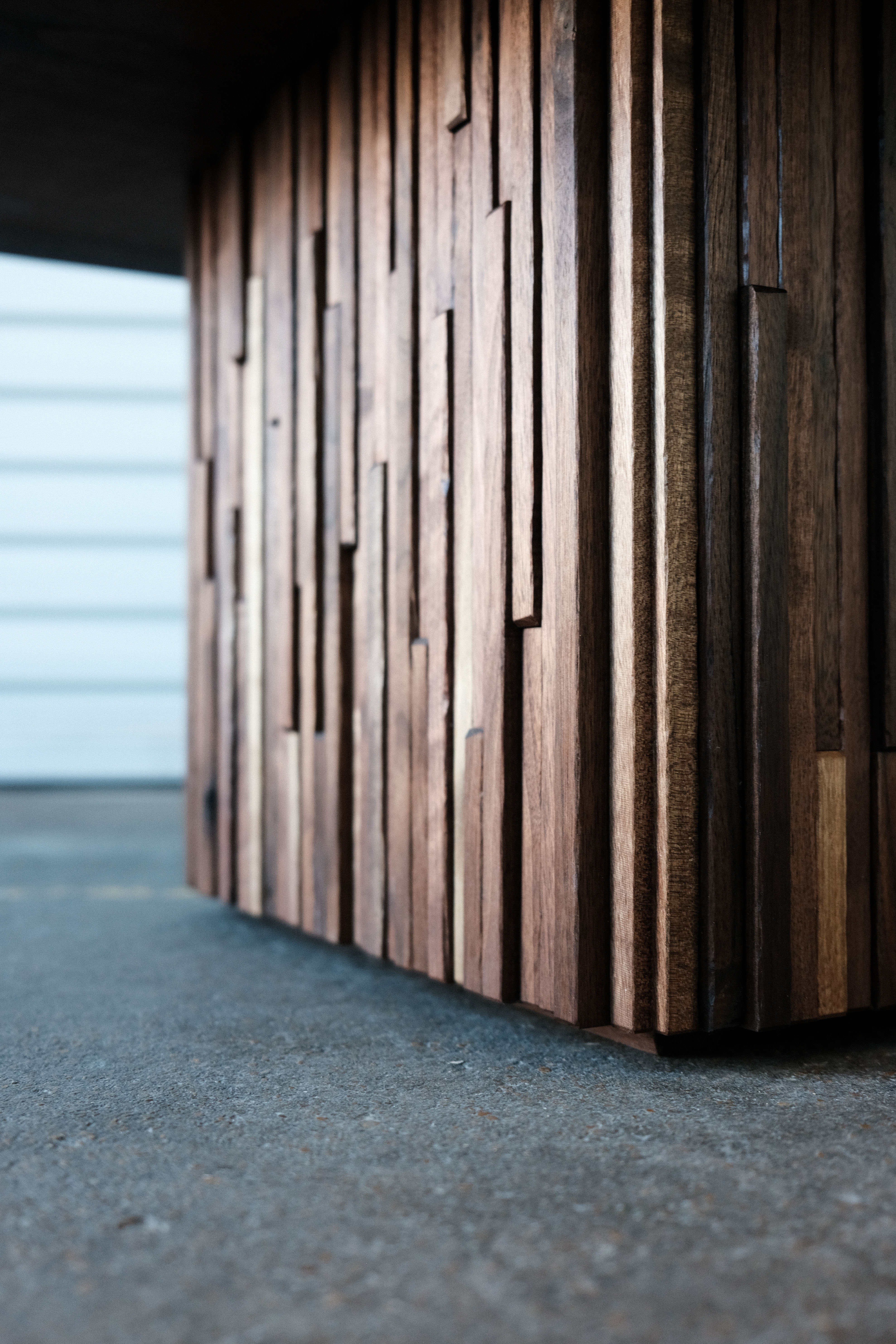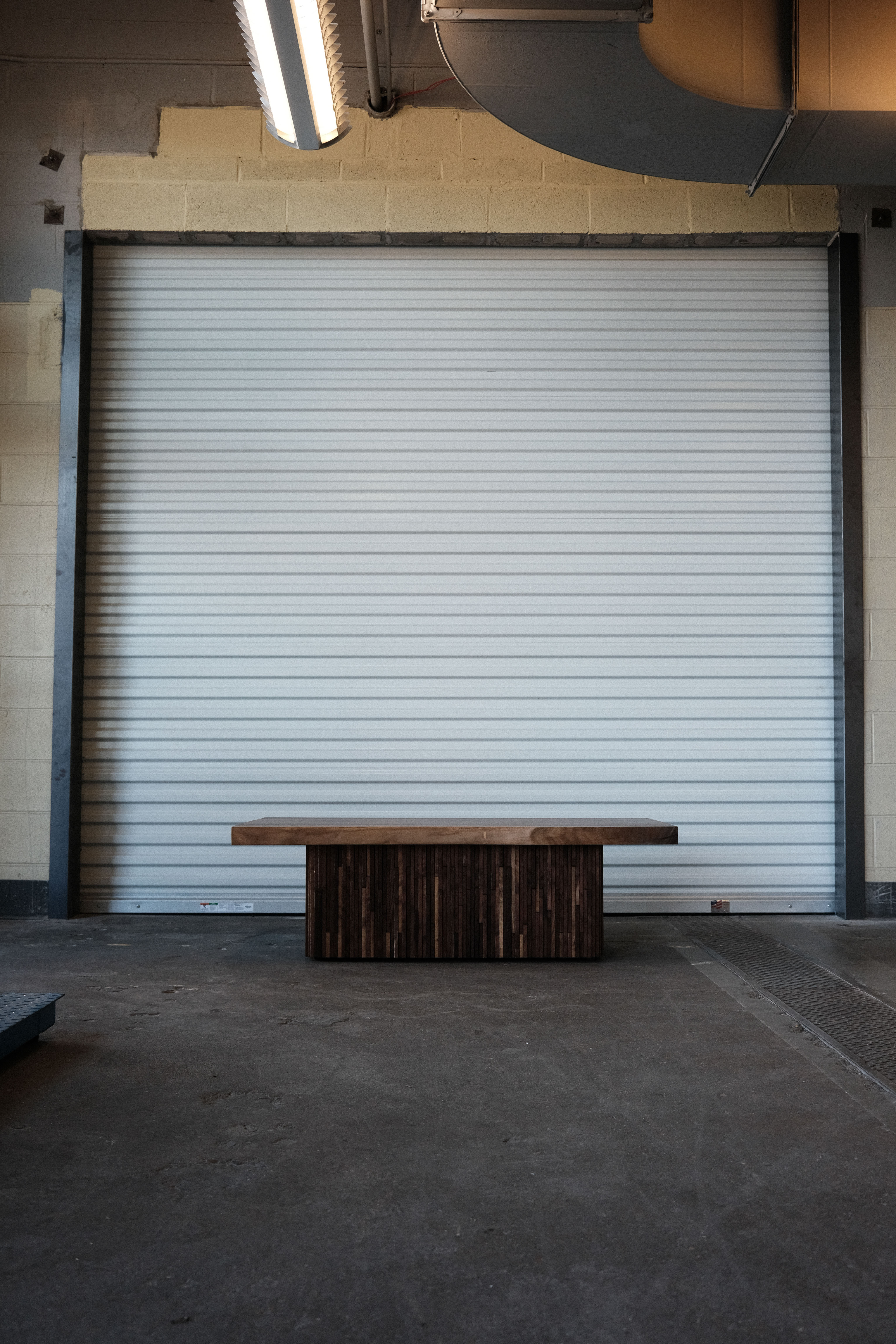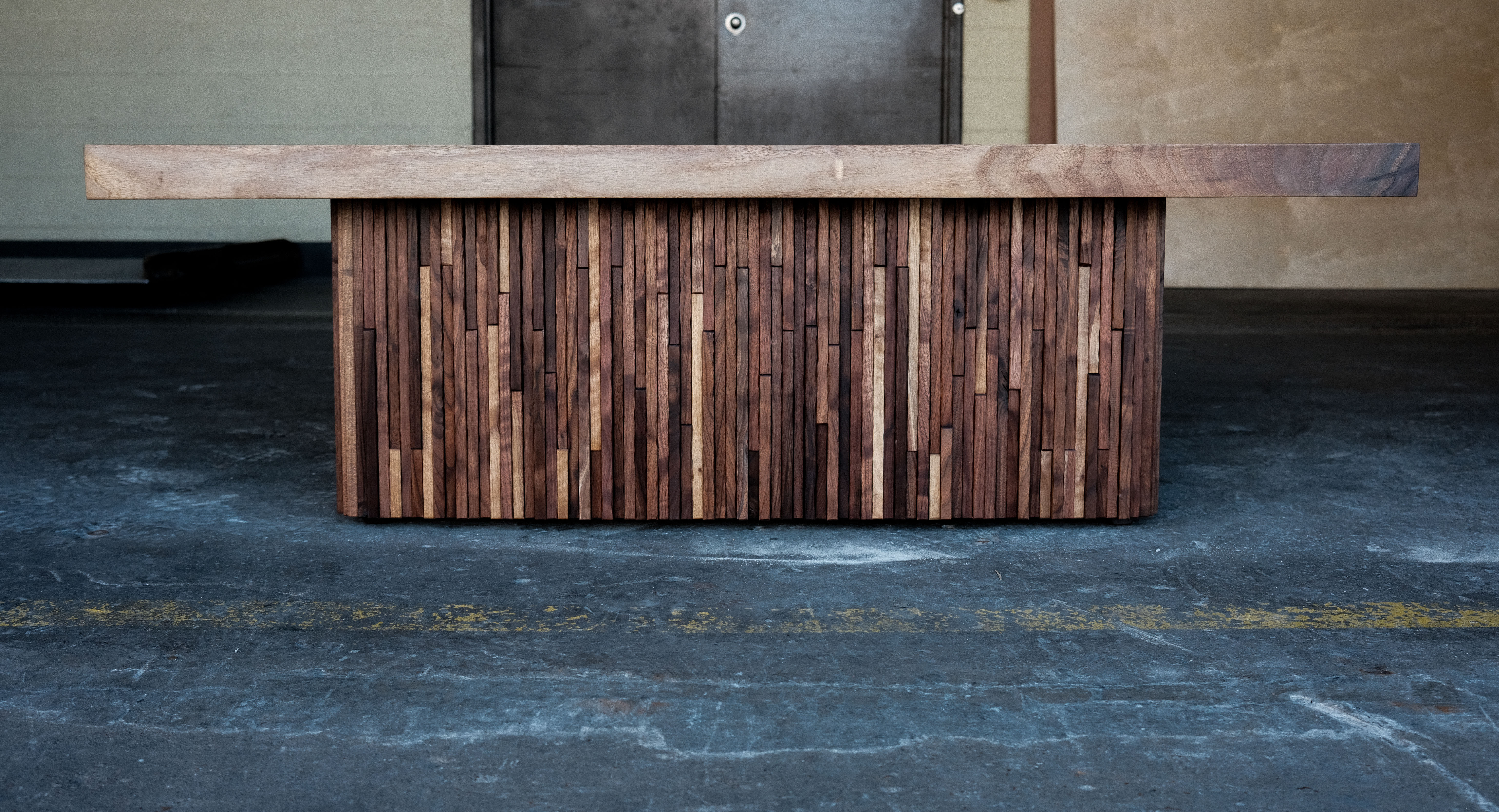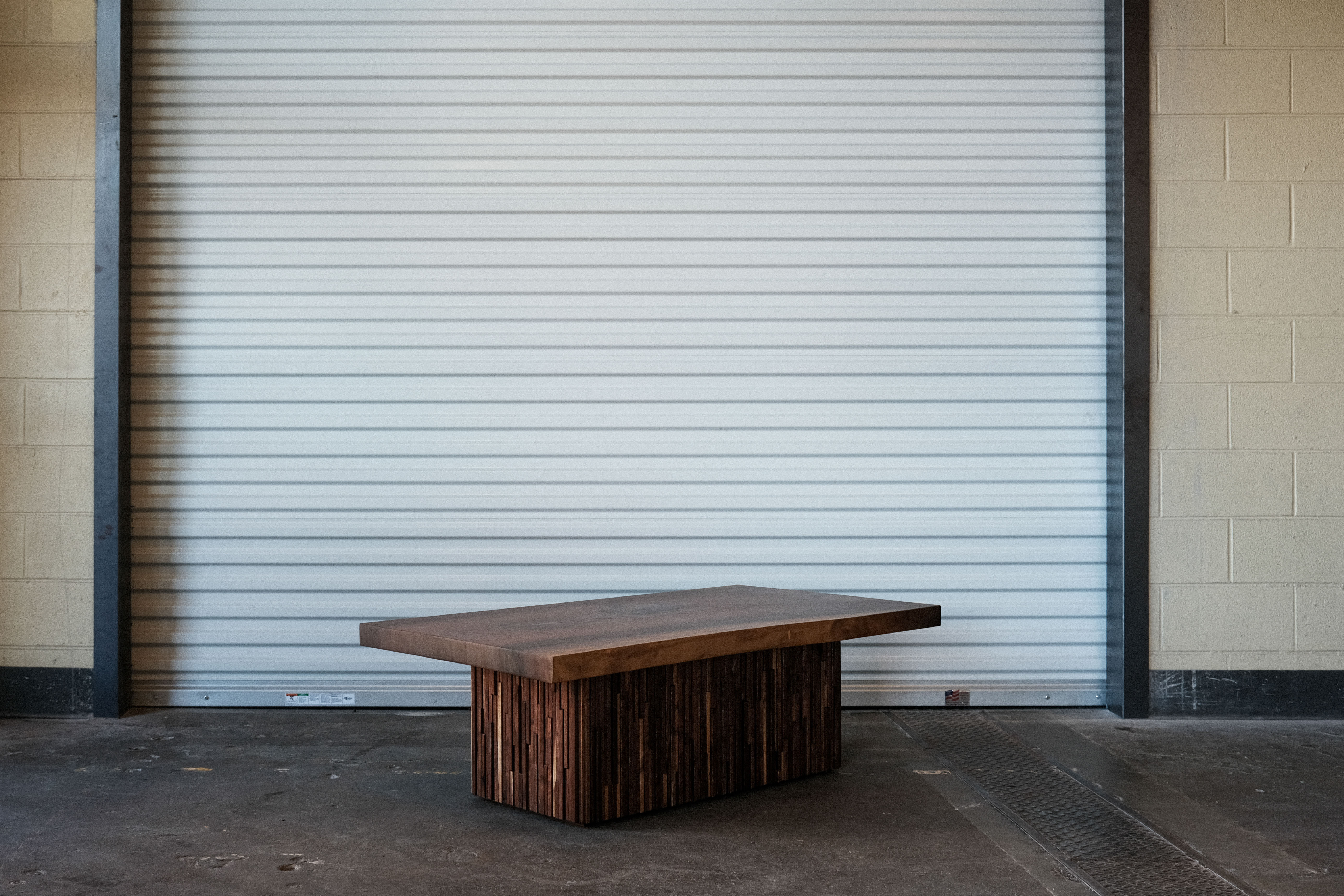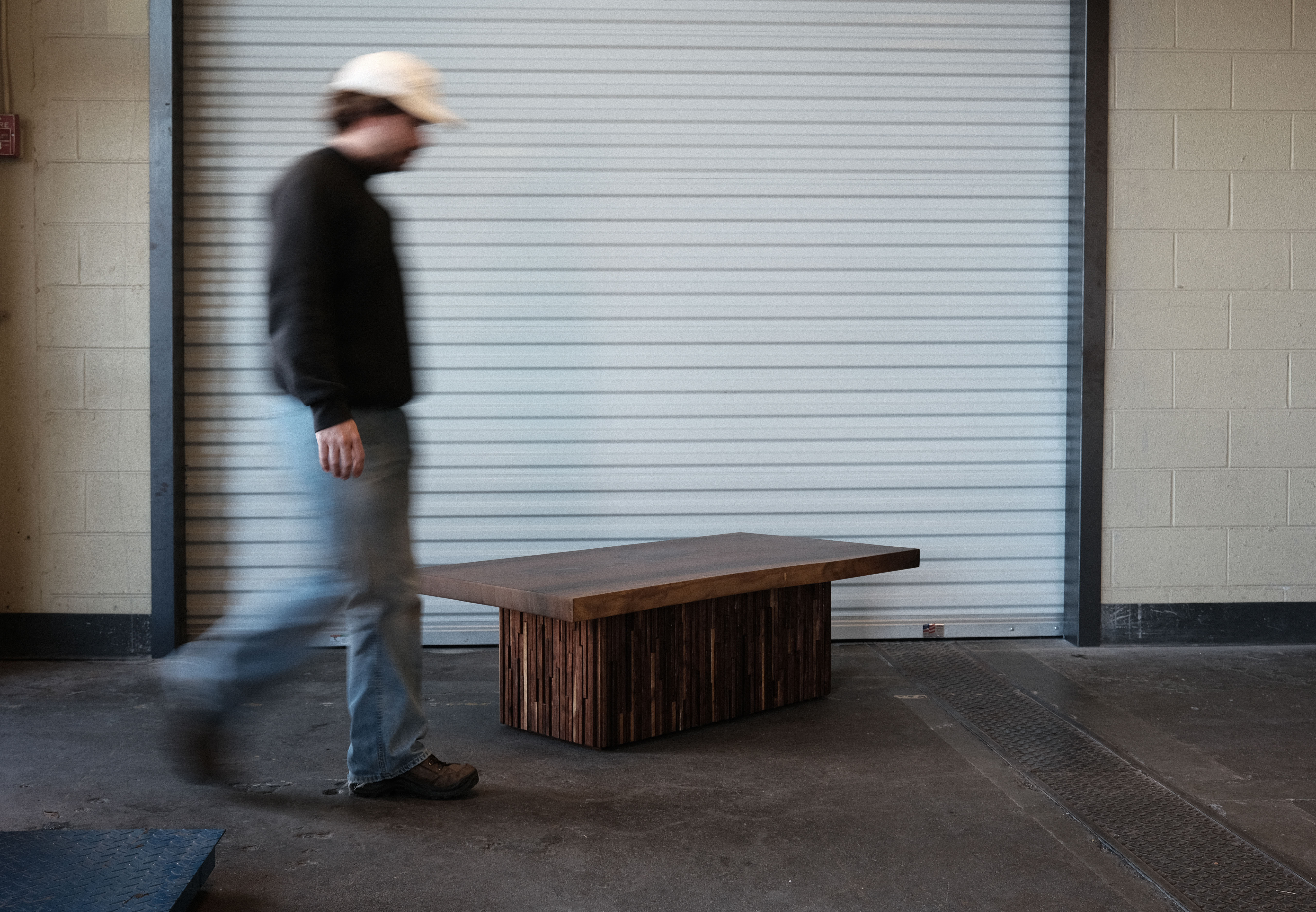 This custom coffee table is a culmination of reflexive design decisions and beautiful local material. The base of the table features an undulating pattern of solid walnut slats, carefully milled and arranged to elevate knotty, checked, and off-color stock. These walnut boards likely would have been overlooked or used in less visible applications. Instead, they were implemented to show off the variety of hues that can be seen within the same tree. It was the ideal start to implementing creative reuse in our shop's design process.