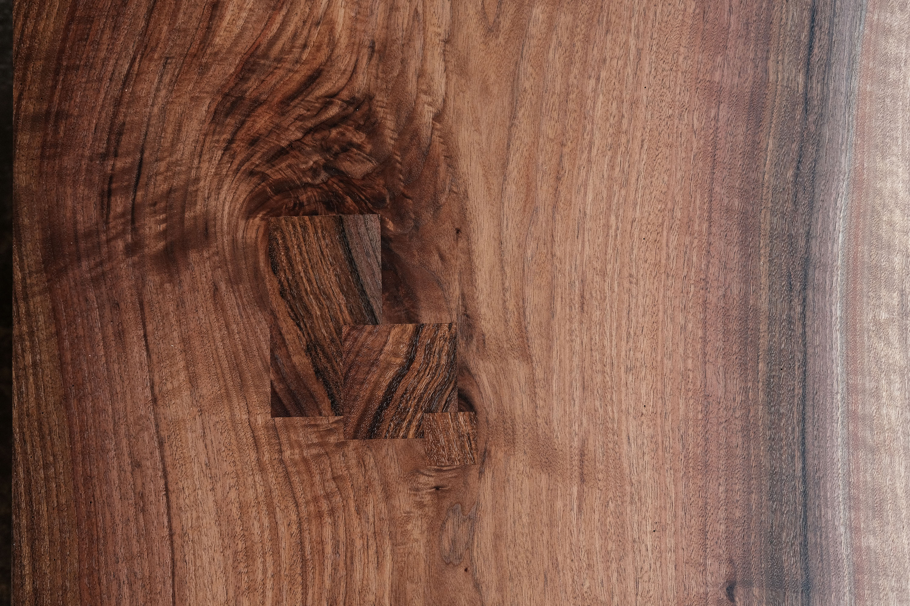 The most prominent feature of this custom coffee table is a stunning slab of local walnut. Embracing its natural imperfections, we reinforced the slab with alternating walnut patches. These swatches are structural, but also provide an interruption to the organic flow of the slab's grain. These abrupt moments reminded us of the breaks and eddies you might see when the current meets a boulder in a small mountain stream.