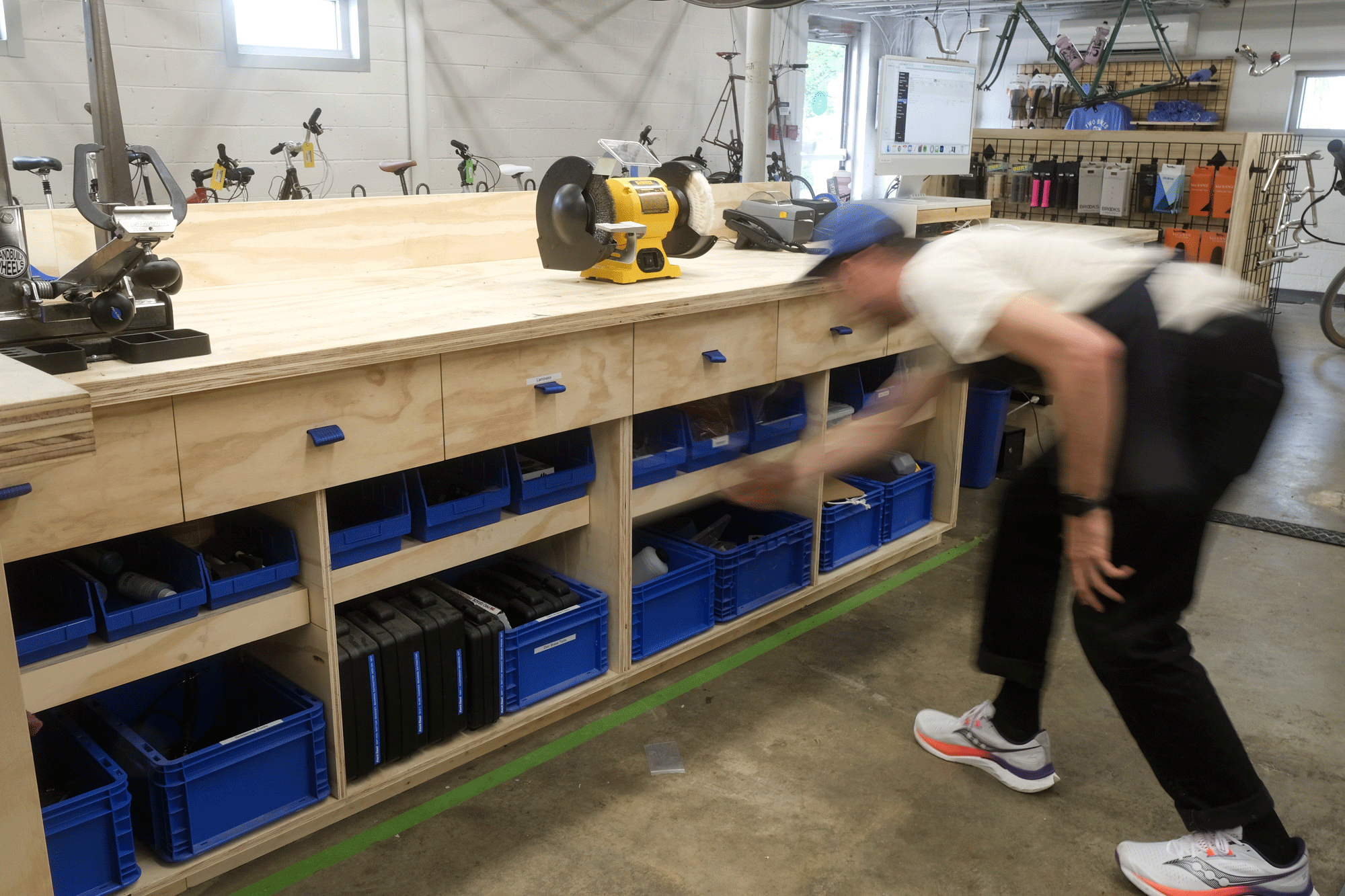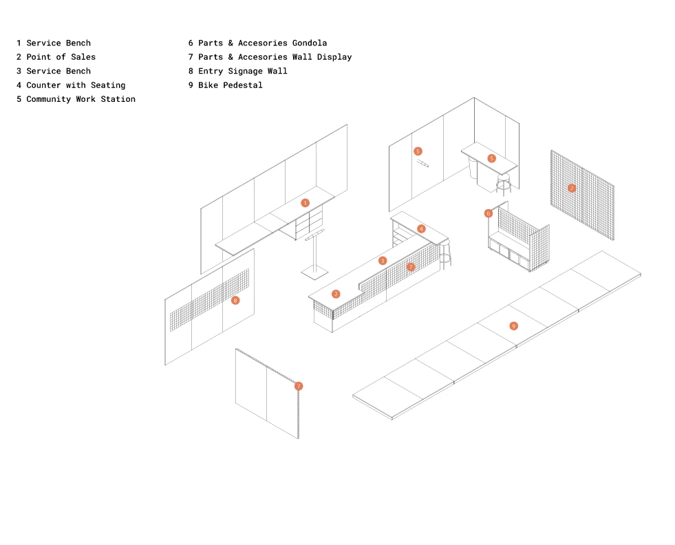 For this project, we leveraged insights from a visit to their Knoxville location to develop a retail environment with improved operational efficiency for the staff and a more fluid customer experience. The service area benches take center stage in the floorplan. Designed for two employees to comfortably service two bikes at the time, the front bench also serves as the POS hub, P+A retail display, and a three-top community counter. Along the length of the front bench are shelves that can be fully extended to see everything in stock. It was important that tools and spare parts all had their own place and were highly visible. No lost parts.